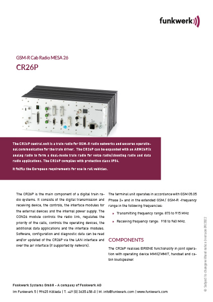 El CR26P es el componente principal de un sistema de radio digital para trenes. Contiene la unidad transmisora y receptora digital, la unidad de control, los módulos de interfaz para conectar dispositivos externos y la fuente de alimentación interna. El módulo CON26 constituye la unidad de control central. Controla la conexión de radio, regula las prioridades de llamada, controla las unidades de control, el módulo para la radio digital del tren, las aplicaciones de datos y los módulos de interfaz. Los datos de software, configuración y diagnóstico del CR26P pueden leerse y actualizarse tanto a través de la interfaz LAN como a través de la interfaz aérea.