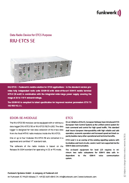 RIU-ETCS - La solución móvil de Funkwerk para aplicaciones ETCS consiste en la versión estándar de unidades de radio totalmente independientes EDOR-5E con módulo de radio móvil GSM-R integrado de última generación MT5-E (8 vatios) y la fuente de alimentación de amplio rango (tensión de a bordo de 24 a 110 V). El EDOR-5E cumple la especificación más reciente para parámetros de receptor mejorados ETSI TS 102 933 V2.1.1.