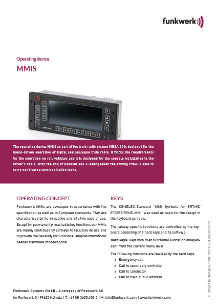 La unidad de control MMIS de la familia de radios ferroviarias MESA 23 está diseñada para el control guiado por menús de radios ferroviarias digitales y analógicas. Cumple los requisitos para su uso en vehículos ferroviarios y está diseñada para su instalación en consola en la cabina del conductor. Con la ayuda de un sistema de intercomunicación compuesto por un auricular y un altavoz, el maquinista puede llevar a cabo una amplia gama de tareas de comunicación.