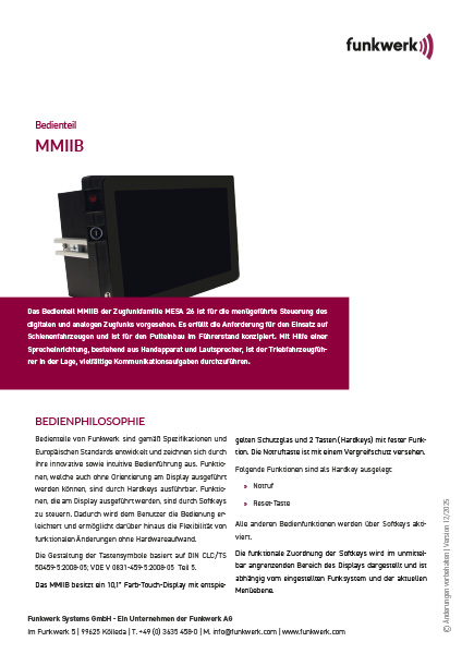 Das Bedienteil MMIIB der Zugfunkfamilie MESA 26 ist für die menügeführte Steuerung des digitalen und analogen Zugfunks vorgesehen. Es erfüllt die Anforderung für den Einsatz auf Schienenfahrzeugen und ist für den Pulteinbau im Führerstand konzipiert. Mit Hilfe einer Sprecheinrichtung, bestehend aus Handapparat und Lautsprecher, ist der Triebfahrzeugführer in der Lage, vielfältige Kommunikationsaufgaben durchzuführen.