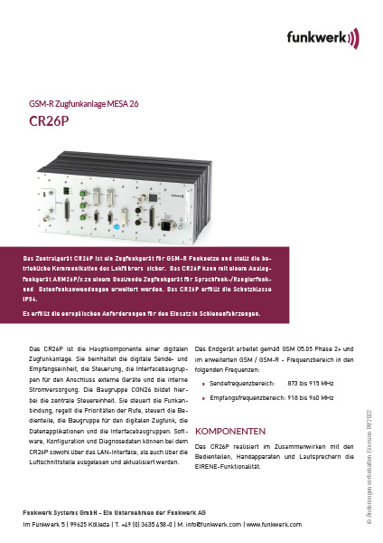 Das Zentralgerät CR26P ist ein Zugfunkgerät für GSM-R Funknetze und stellt die betriebliche Kommunikation des Lokführers sicher. Das CR26P kann mit einem Analogfunkgerät ARM26P/x zu einem Dualmode Zugfunkgerät für Sprachfunk-/Rangierfunkund Datenfunkanwendungen erweitert werden. Das CR26P erfüllt die Schutzklasse IP54. Es erfüllt die europäischen Anforderungen für den Einsatz in Schienenfahrzeugen.