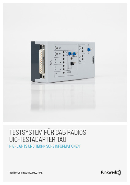 Funkwerk hat den Testadapter TAU als Werkzeug zur Wartung, Prüfung und Inbetriebnahme von Zugfunkanlagen entwickelt. Der Testadapter TAU ist ein Gerät zum schnellen und einfachen Prüfen des sachgemäßen Anschlusses einer Zugfunkanlage an die Wagendurchgangsleitung nach UIC-Merkblatt 558.